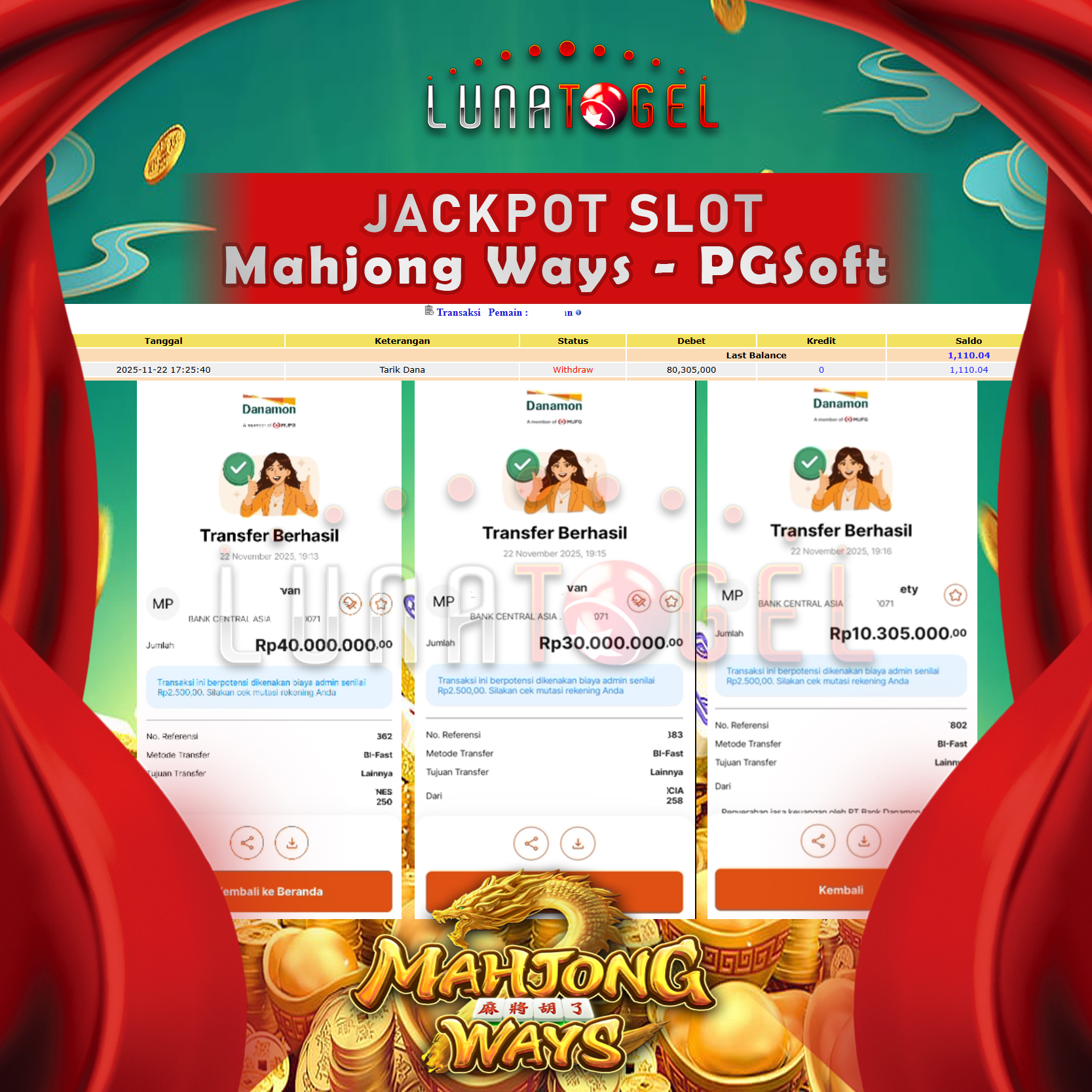 Selamat untuk User ID: evaxxxxxx yang berhasil meraih kemenangan besar atau JP PAUS di Permainan Slot Mahjong Ways Provider PGSoft Rp.80,305,000,-